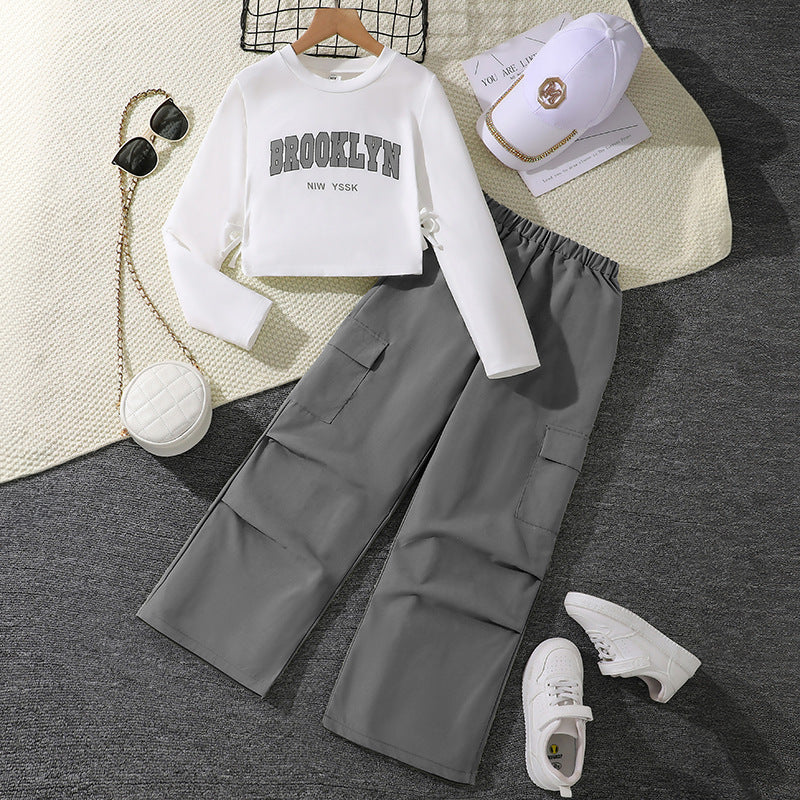 Girl All-match Letter Long Sleeve Sweater Wide Leg Pleated Overalls