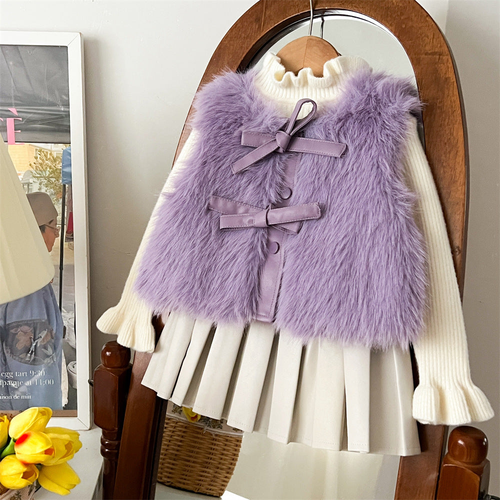 Girls' Autumn And Winter Warm Fur Waistcoat Leather Skirt Suit