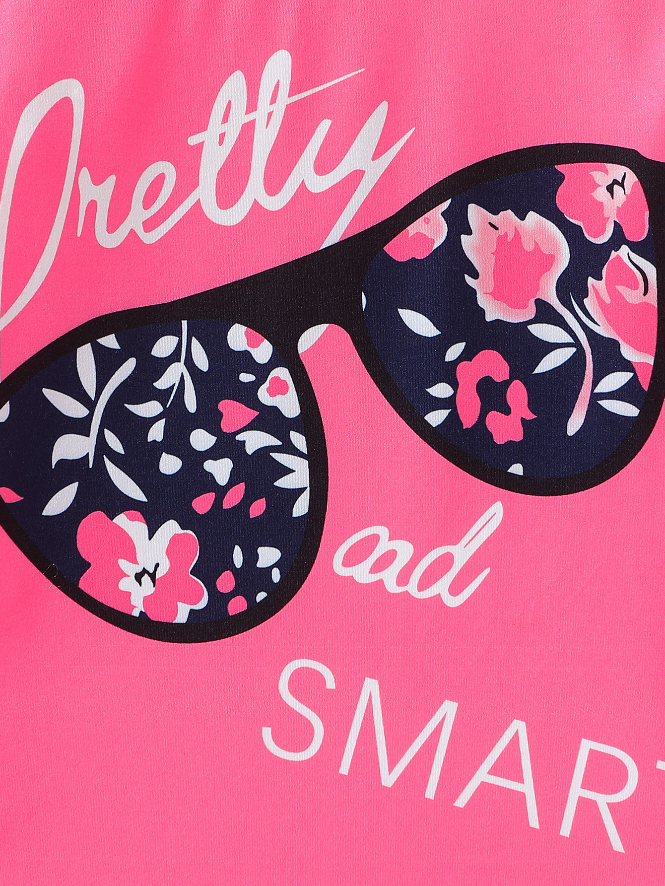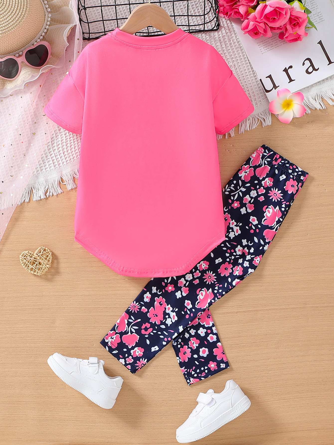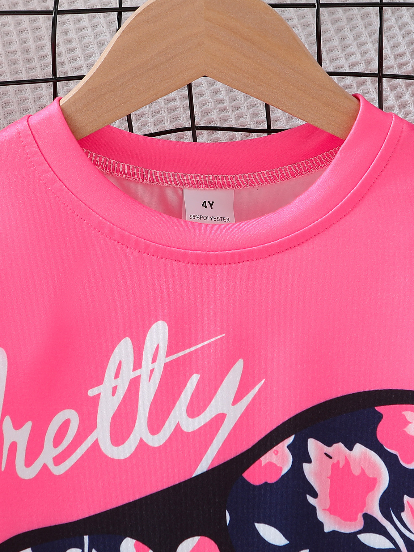 Girls Heat Transfer Patch Short Sleeve Round Neck Top Casual Pants Suit