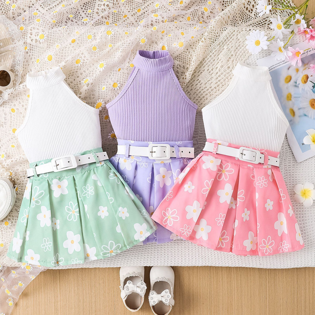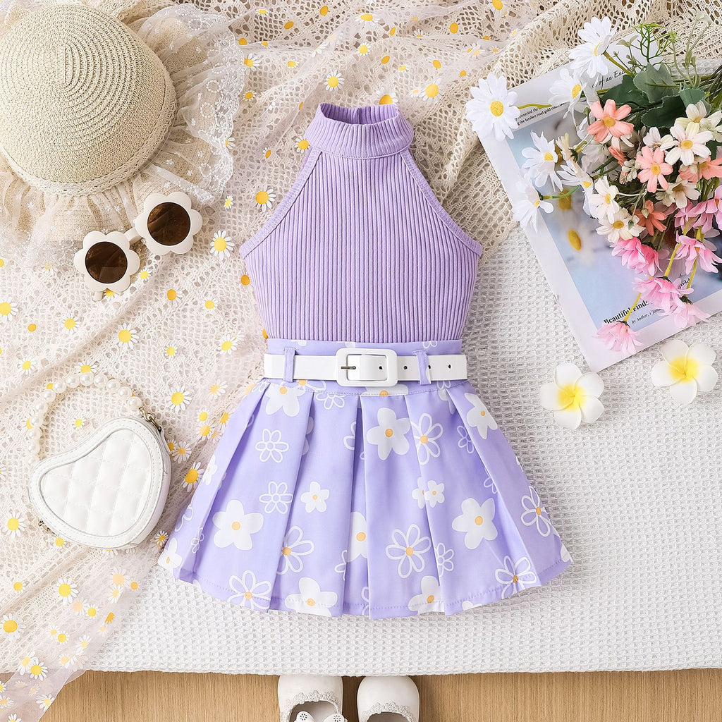 Girls' Pit Striped Halter Sleeveless Top Printed Pleated Skirt Belted Suit