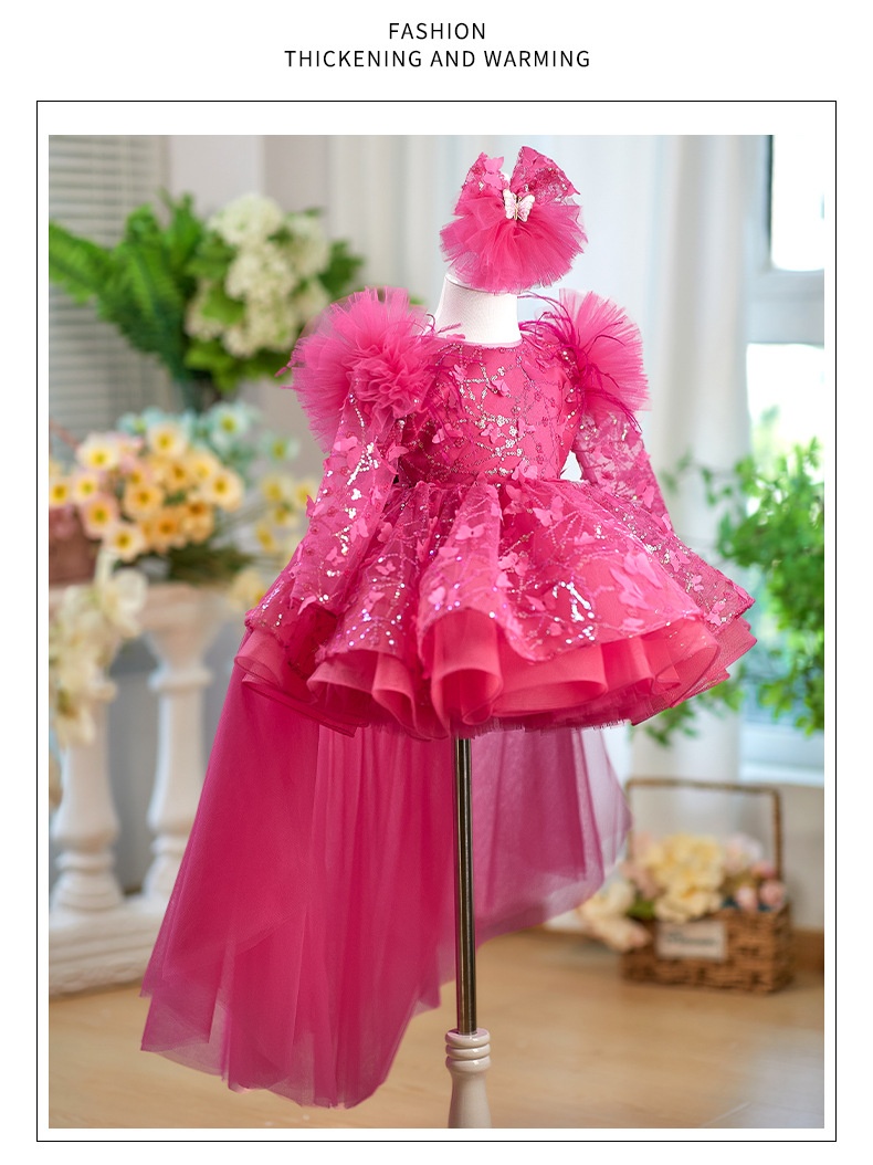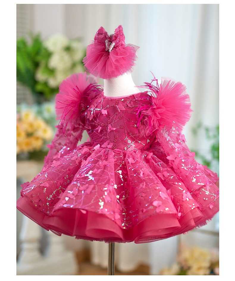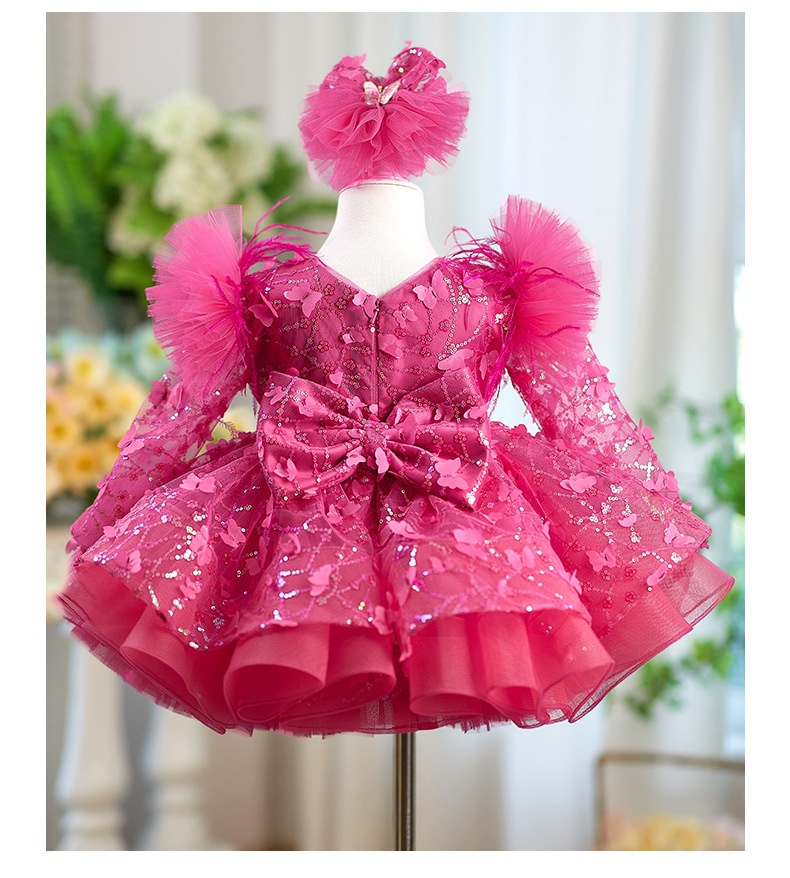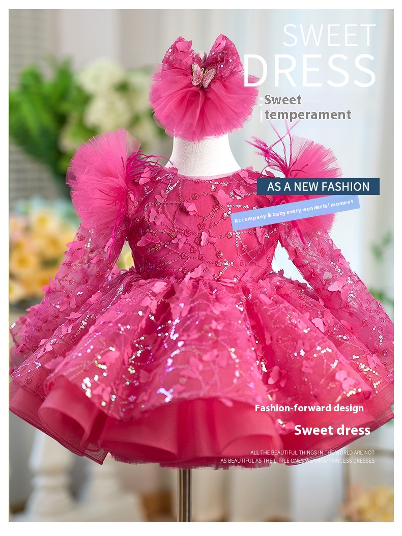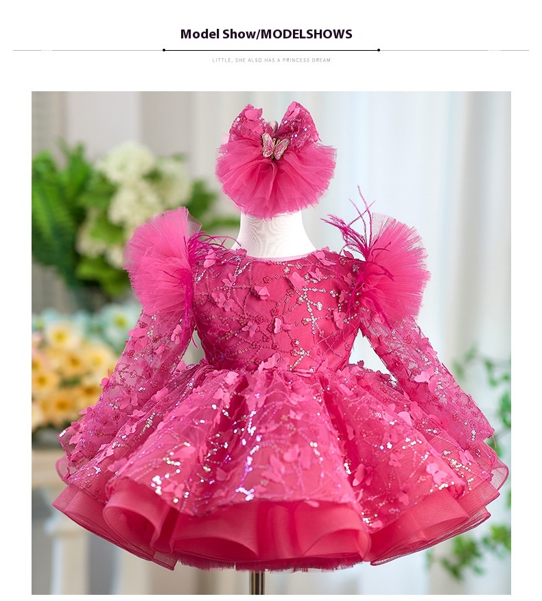 Rose Red Butterfly Sequined Long Sleeve Princess Children's Birthday Party Dress