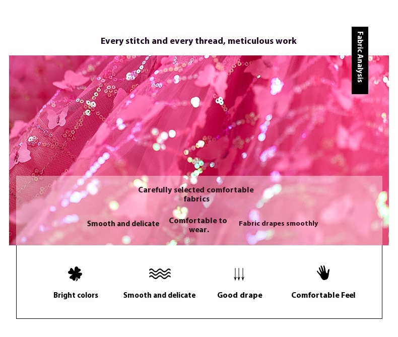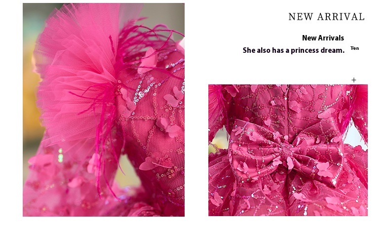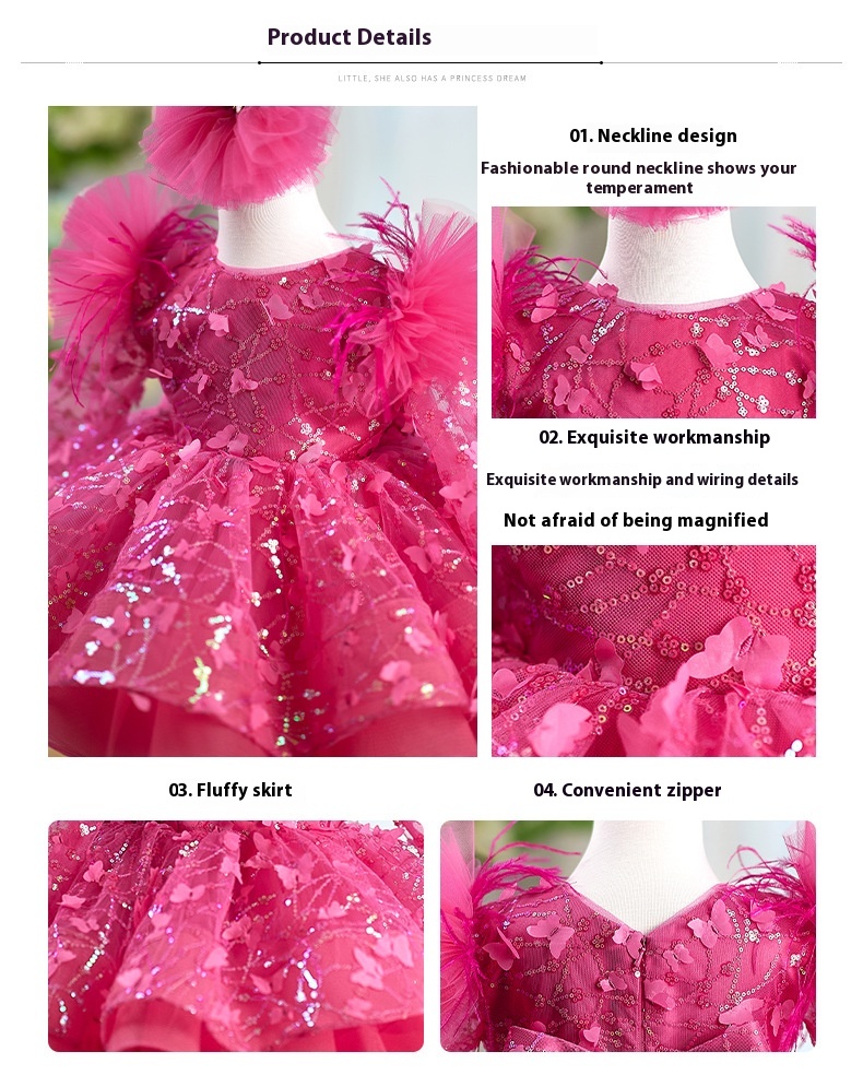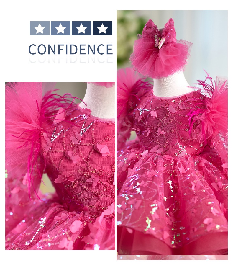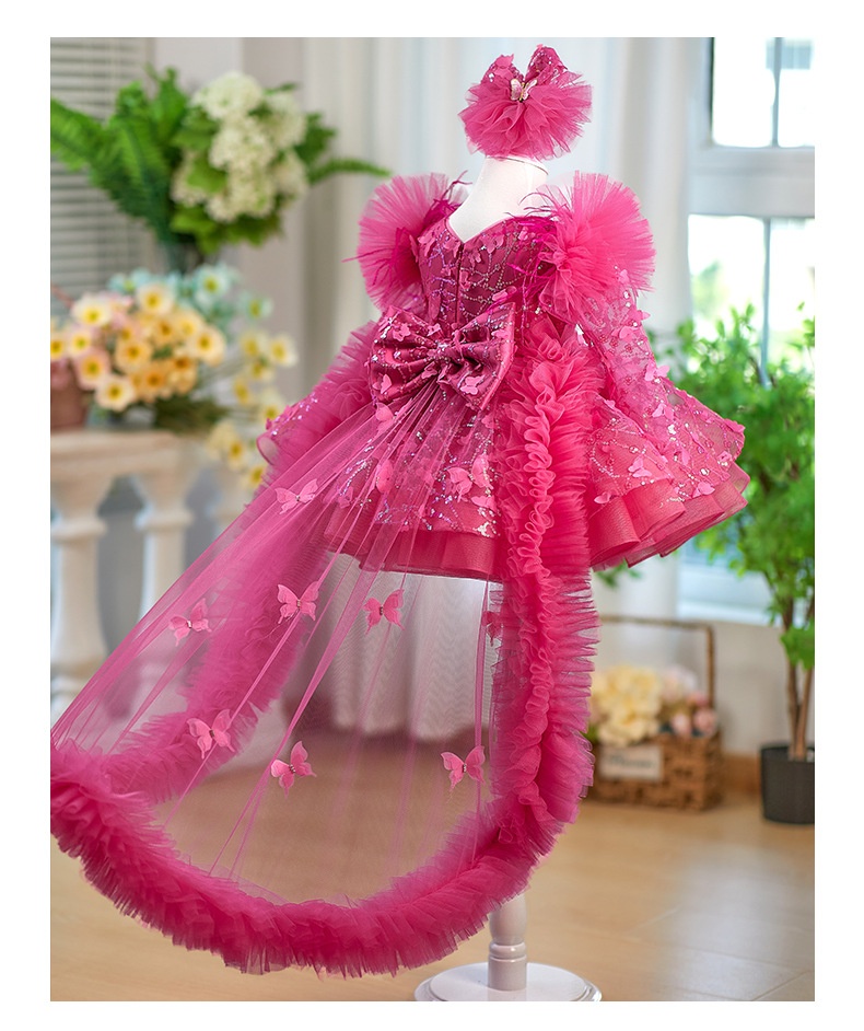 Rose Red Butterfly Sequined Long Sleeve Princess Children's Birthday Party Dress