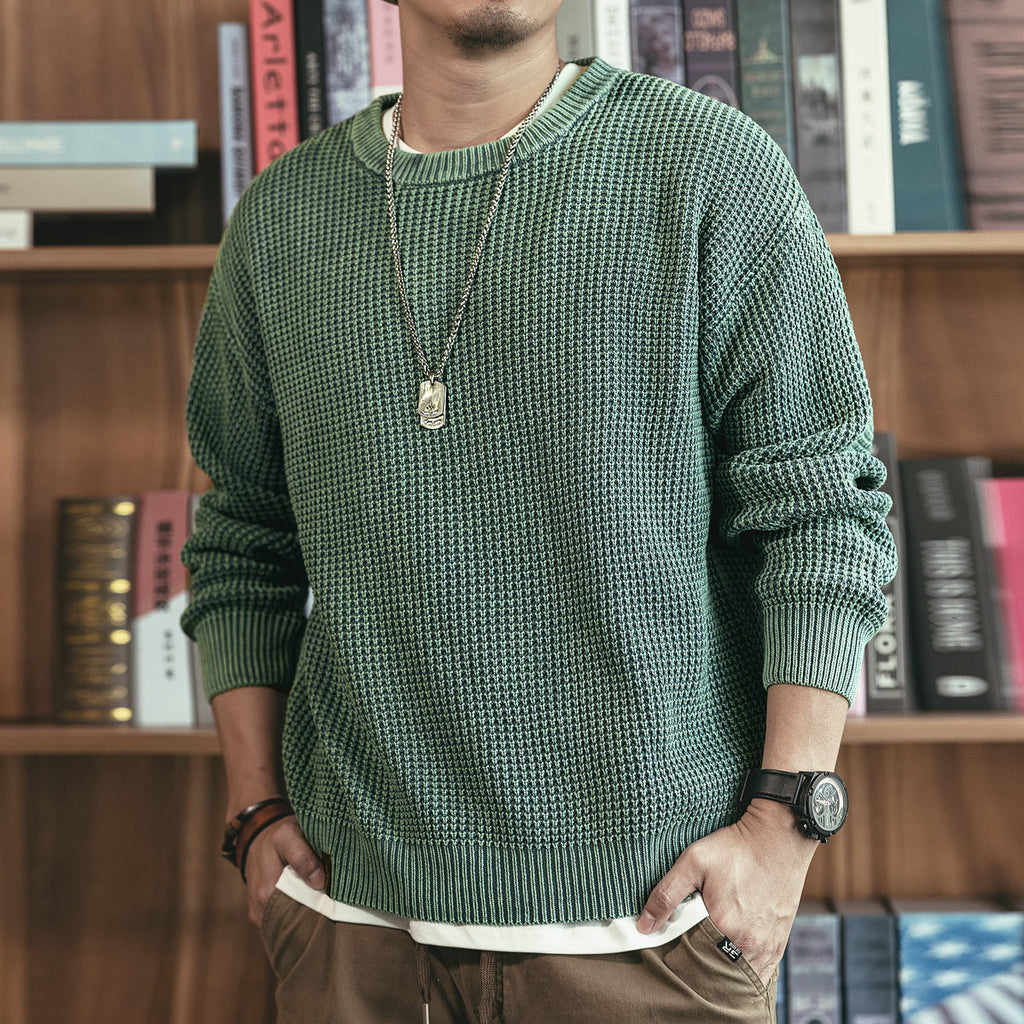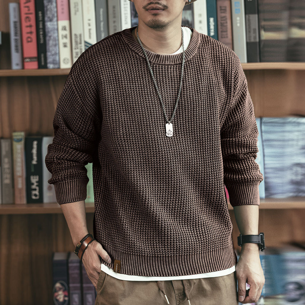 Pineapple Pattern Waffle Thick Needle Washed Round Neck Sweater